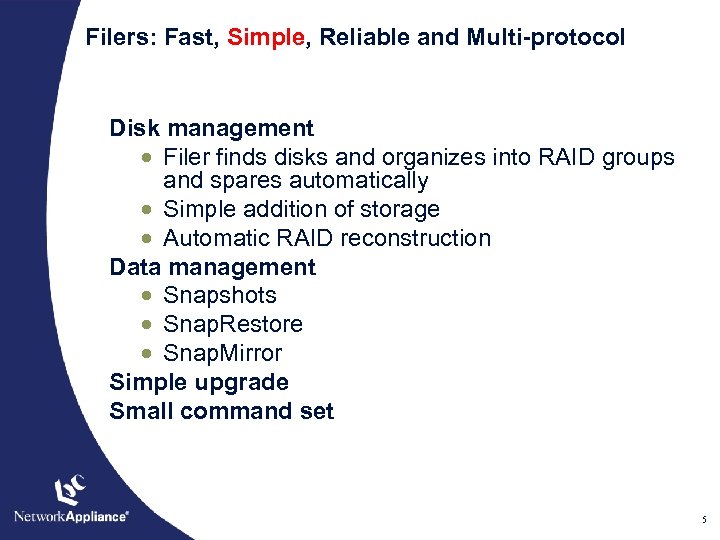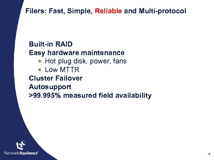 Filers: Fast, Simple, Reliable and Multi-protocol Disk management · Filer finds disks and organizes into RAID groups and spares automatically · Simple addition of storage · Automatic RAID reconstruction Data management · Snapshots · Snap. Restore · Snap. Mirror Simple upgrade Small command set 5