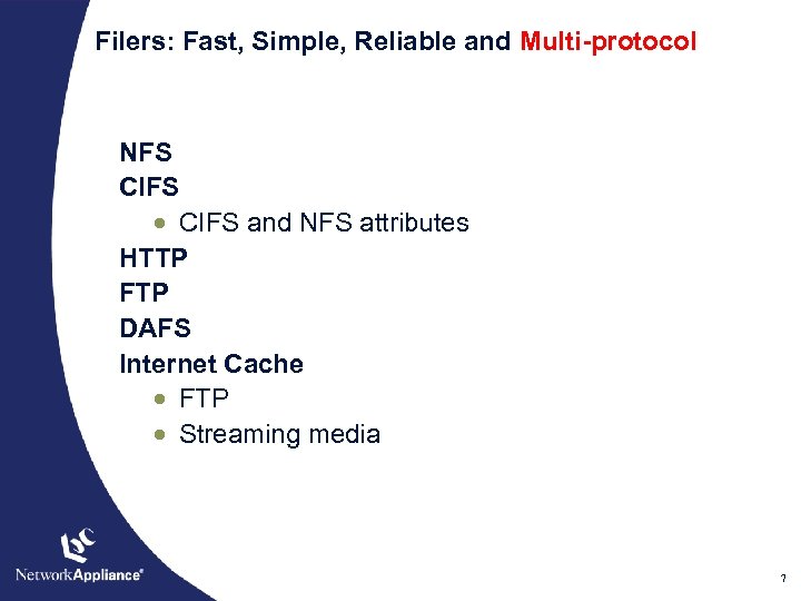 Filers: Fast, Simple, Reliable and Multi-protocol NFS CIFS · CIFS and NFS attributes HTTP FTP DAFS Internet Cache · FTP · Streaming media 7