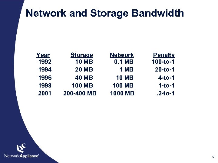 Network and Storage Bandwidth Year 1992 1994 1996 1998 2001 Storage 10 MB 20 MB 40 MB 100 MB 200 -400 MB Network 0. 1 MB 1000 MB Penalty 100 -to-1 20 -to-1 4 -to-1 1 -to-1. 2 -to-1 9