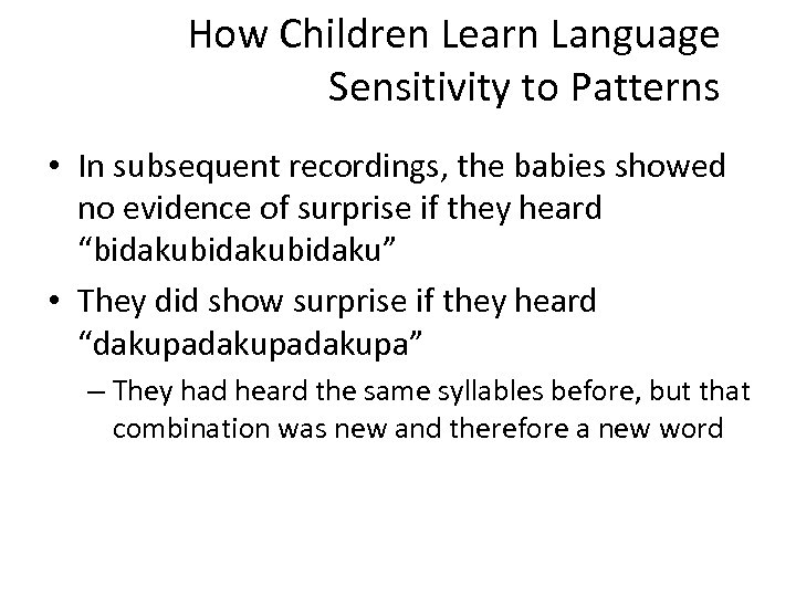 How Children Learn Language Sensitivity to Patterns • In subsequent recordings, the babies showed no evidence of surprise if they heard “bidakubidaku” • They did show surprise if they heard “dakupadakupa” – They had heard the same syllables before, but that combination was new and therefore a new word