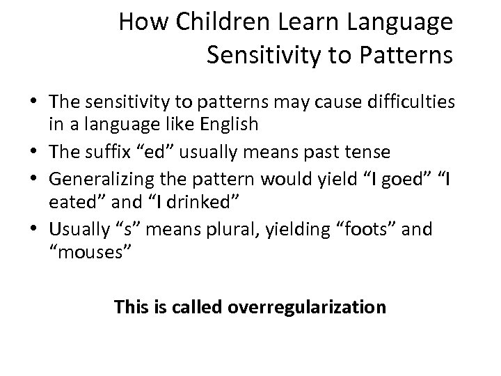 How Children Learn Language Sensitivity to Patterns • The sensitivity to patterns may cause difficulties in a language like English • The suffix “ed” usually means past tense • Generalizing the pattern would yield “I goed” “I eated” and “I drinked” • Usually “s” means plural, yielding “foots” and “mouses” This is called overregularization