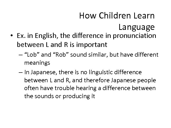 How Children Learn Language • Ex. in English, the difference in pronunciation between L and R is important – “Lob” and “Rob” sound similar, but have different meanings – In Japanese, there is no linguistic difference between L and R, and therefore Japanese people often have trouble hearing a difference between the sounds or producing it