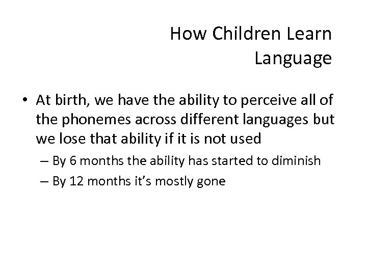 How Children Learn Language • At birth, we have the ability to perceive all of the phonemes across different languages but we lose that ability if it is not used – By 6 months the ability has started to diminish – By 12 months it’s mostly gone