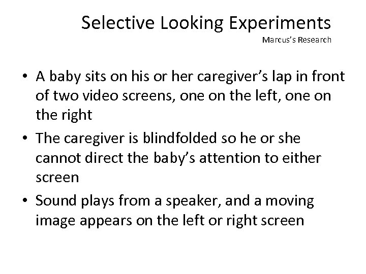 Selective Looking Experiments Marcus’s Research • A baby sits on his or her caregiver’s lap in front of two video screens, one on the left, one on the right • The caregiver is blindfolded so he or she cannot direct the baby’s attention to either screen • Sound plays from a speaker, and a moving image appears on the left or right screen