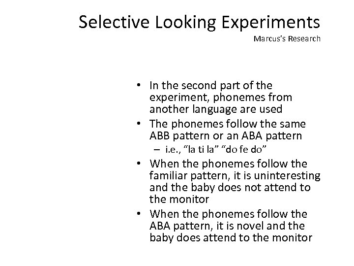 Selective Looking Experiments Marcus’s Research • In the second part of the experiment, phonemes from another language are used • The phonemes follow the same ABB pattern or an ABA pattern – i. e. , “la ti la” “do fe do” • When the phonemes follow the familiar pattern, it is uninteresting and the baby does not attend to the monitor • When the phonemes follow the ABA pattern, it is novel and the baby does attend to the monitor