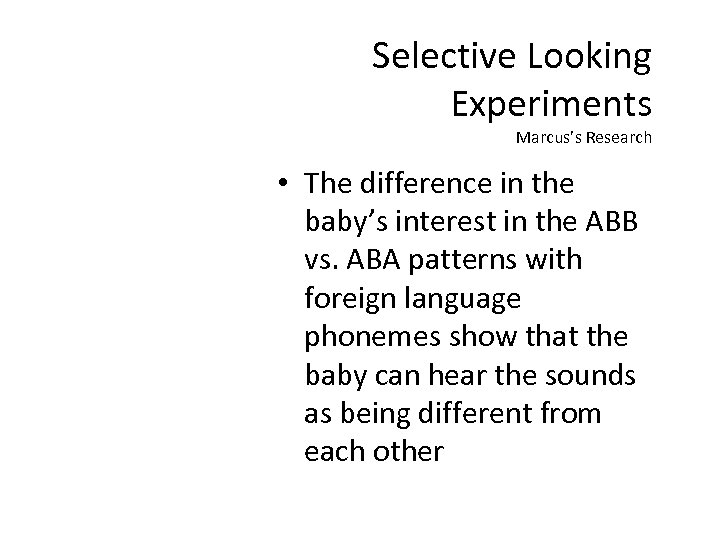 Selective Looking Experiments Marcus’s Research • The difference in the baby’s interest in the ABB vs. ABA patterns with foreign language phonemes show that the baby can hear the sounds as being different from each other