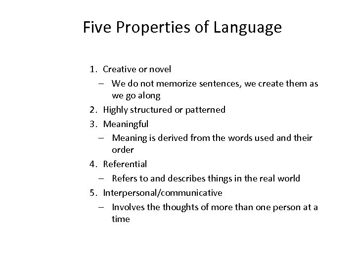 Five Properties of Language 1. Creative or novel – We do not memorize sentences, we create them as we go along 2. Highly structured or patterned 3. Meaningful – Meaning is derived from the words used and their order 4. Referential – Refers to and describes things in the real world 5. Interpersonal/communicative – Involves the thoughts of more than one person at a time