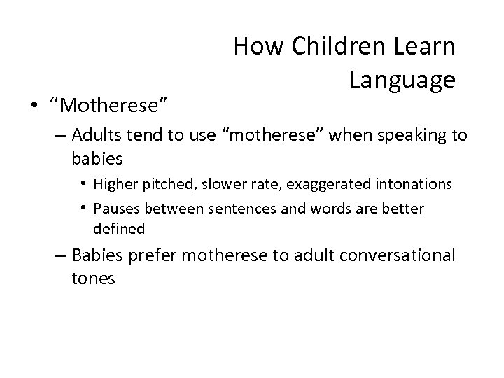 • “Motherese” How Children Learn Language – Adults tend to use “motherese” when speaking to babies • Higher pitched, slower rate, exaggerated intonations • Pauses between sentences and words are better defined – Babies prefer motherese to adult conversational tones