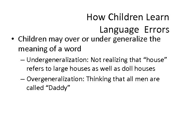 How Children Learn Language Errors • Children may over or under generalize the meaning of a word – Undergeneralization: Not realizing that “house” refers to large houses as well as doll houses – Overgeneralization: Thinking that all men are called “Daddy”