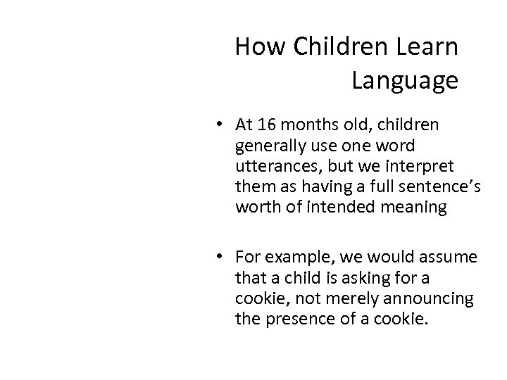 How Children Learn Language • At 16 months old, children generally use one word utterances, but we interpret them as having a full sentence’s worth of intended meaning • For example, we would assume that a child is asking for a cookie, not merely announcing the presence of a cookie.