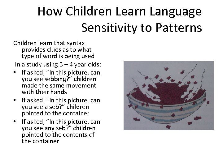 How Children Learn Language Sensitivity to Patterns Children learn that syntax provides clues as to what type of word is being used In a study using 3 – 4 year olds: • If asked, “In this picture, can you see sebbing? ” children made the same movement with their hands • If asked, “In this picture, can you see a seb? ” children pointed to the container • If asked, “In this picture, can you see any seb? ” children pointed to the contents of the container
