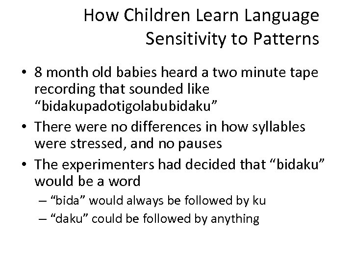 How Children Learn Language Sensitivity to Patterns • 8 month old babies heard a two minute tape recording that sounded like “bidakupadotigolabubidaku” • There were no differences in how syllables were stressed, and no pauses • The experimenters had decided that “bidaku” would be a word – “bida” would always be followed by ku – “daku” could be followed by anything