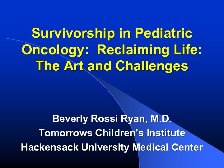 Survivorship in Pediatric Oncology: Reclaiming Life: The Art and Challenges Beverly Rossi Ryan, M. D. Tomorrows Children’s Institute Hackensack University Medical Center