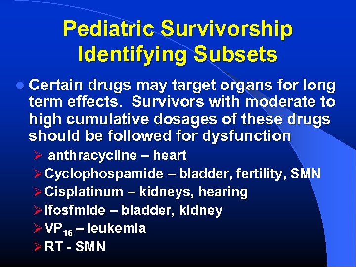 Pediatric Survivorship Identifying Subsets l Certain drugs may target organs for long term effects. Survivors with moderate to high cumulative dosages of these drugs should be followed for dysfunction Ø anthracycline – heart Ø Cyclophospamide – bladder, fertility, SMN Ø Cisplatinum – kidneys, hearing Ø Ifosfmide – bladder, kidney Ø VP 16 – leukemia Ø RT - SMN