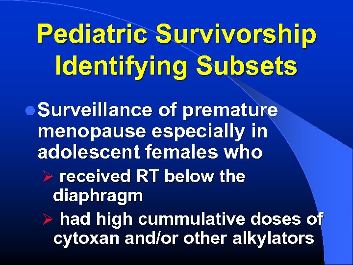 Pediatric Survivorship Identifying Subsets l Surveillance of premature menopause especially in adolescent females who Ø received RT below the diaphragm Ø had high cummulative doses of cytoxan and/or other alkylators