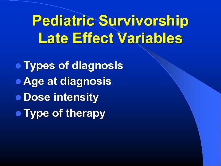 Pediatric Survivorship Late Effect Variables l Types of diagnosis l Age at diagnosis l Dose intensity l Type of therapy