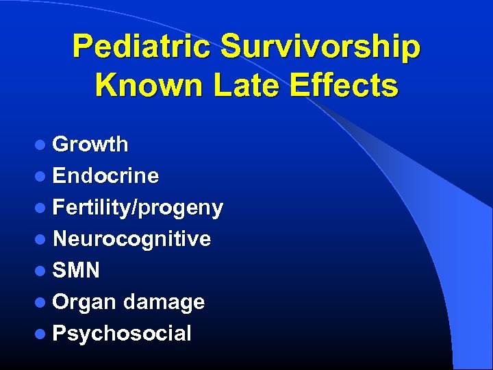 Pediatric Survivorship Known Late Effects l Growth l Endocrine l Fertility/progeny l Neurocognitive l SMN l Organ damage l Psychosocial