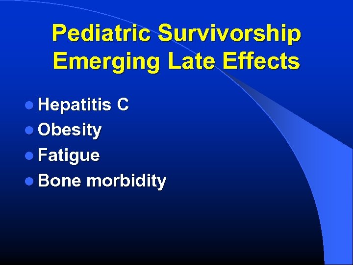 Pediatric Survivorship Emerging Late Effects l Hepatitis C l Obesity l Fatigue l Bone morbidity