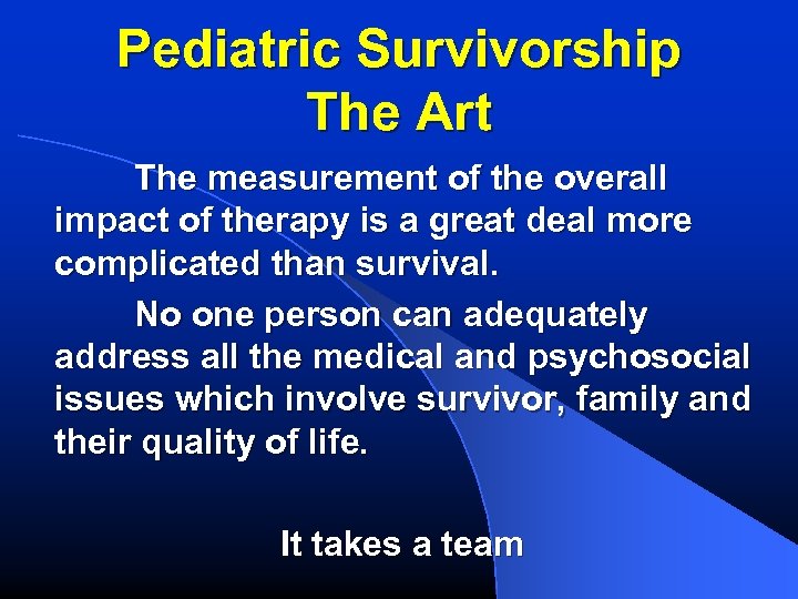 Pediatric Survivorship The Art The measurement of the overall impact of therapy is a great deal more complicated than survival. No one person can adequately address all the medical and psychosocial issues which involve survivor, family and their quality of life. It takes a team