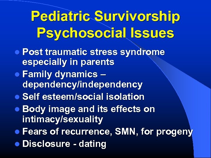 Pediatric Survivorship Psychosocial Issues l Post traumatic stress syndrome especially in parents l Family dynamics – dependency/independency l Self esteem/social isolation l Body image and its effects on intimacy/sexuality l Fears of recurrence, SMN, for progeny l Disclosure - dating