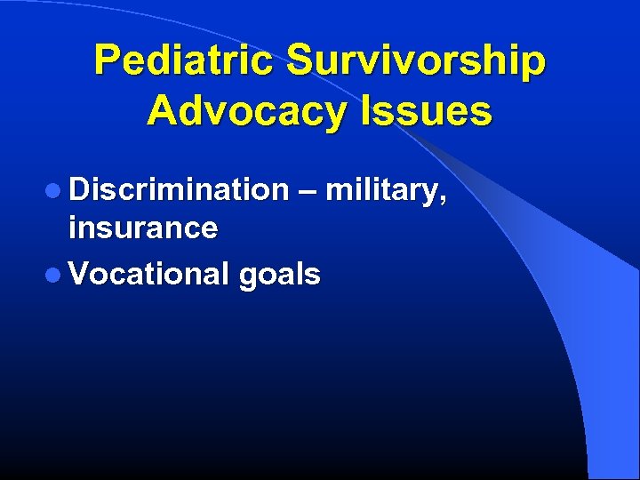 Pediatric Survivorship Advocacy Issues l Discrimination – military, insurance l Vocational goals