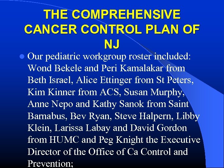 THE COMPREHENSIVE CANCER CONTROL PLAN OF NJ l Our pediatric workgroup roster included: Wond Bekele and Peri Kamalakar from Beth Israel, Alice Ettinger from St Peters, Kim Kinner from ACS, Susan Murphy, Anne Nepo and Kathy Sanok from Saint Barnabus, Bev Ryan, Steve Halpern, Libby Klein, Larissa Labay and David Gordon from HUMC and Peg Knight the Executive Director of the Office of Ca Control and Prevention;