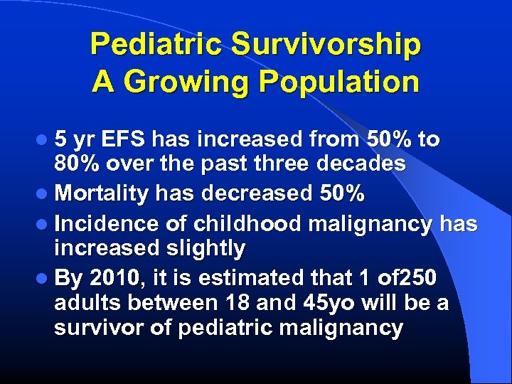 Pediatric Survivorship A Growing Population l 5 yr EFS has increased from 50% to 80% over the past three decades l Mortality has decreased 50% l Incidence of childhood malignancy has increased slightly l By 2010, it is estimated that 1 of 250 adults between 18 and 45 yo will be a survivor of pediatric malignancy