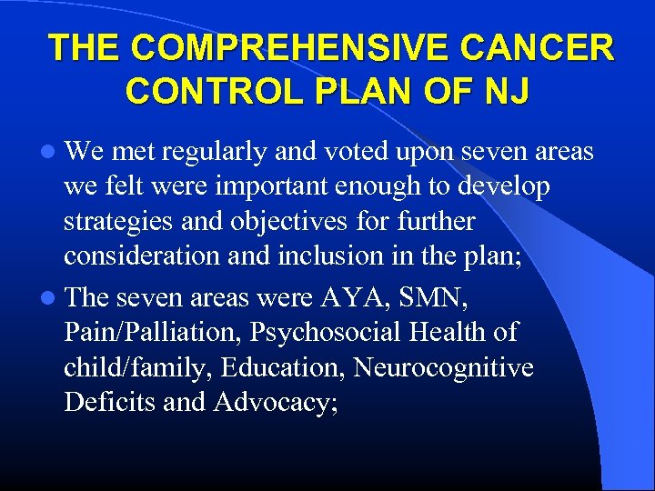 THE COMPREHENSIVE CANCER CONTROL PLAN OF NJ l We met regularly and voted upon seven areas we felt were important enough to develop strategies and objectives for further consideration and inclusion in the plan; l The seven areas were AYA, SMN, Pain/Palliation, Psychosocial Health of child/family, Education, Neurocognitive Deficits and Advocacy;