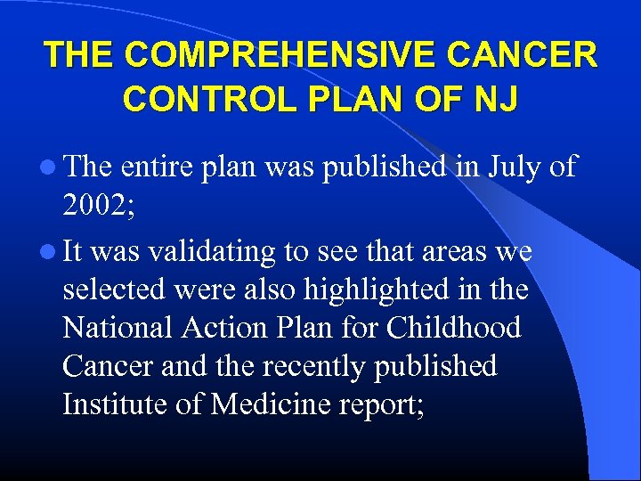THE COMPREHENSIVE CANCER CONTROL PLAN OF NJ l The entire plan was published in July of 2002; l It was validating to see that areas we selected were also highlighted in the National Action Plan for Childhood Cancer and the recently published Institute of Medicine report;