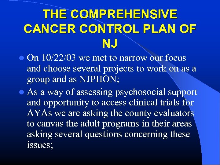 THE COMPREHENSIVE CANCER CONTROL PLAN OF NJ l On 10/22/03 we met to narrow our focus and choose several projects to work on as a group and as NJPHON; l As a way of assessing psychosocial support and opportunity to access clinical trials for AYAs we are asking the county evaluators to canvas the adult programs in their areas asking several questions concerning these issues;
