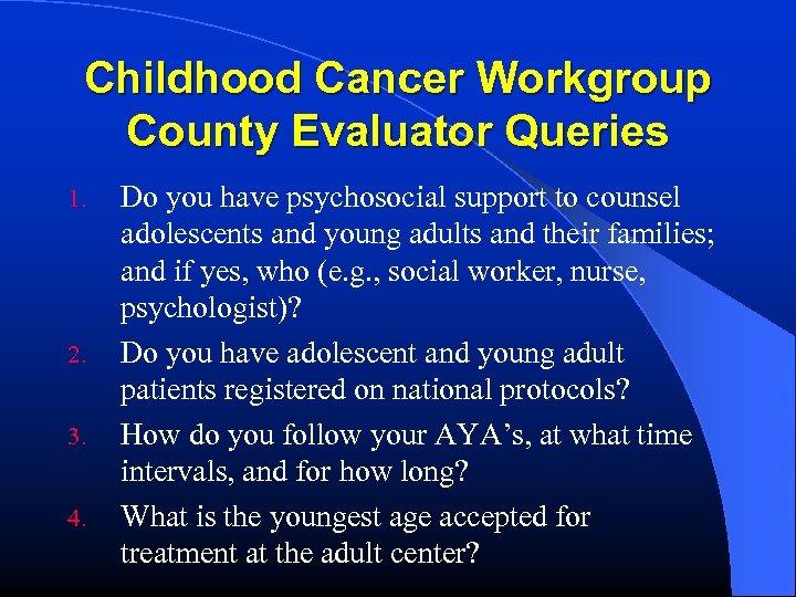 Childhood Cancer Workgroup County Evaluator Queries 1. 2. 3. 4. Do you have psychosocial support to counsel adolescents and young adults and their families; and if yes, who (e. g. , social worker, nurse, psychologist)? Do you have adolescent and young adult patients registered on national protocols? How do you follow your AYA’s, at what time intervals, and for how long? What is the youngest age accepted for treatment at the adult center?