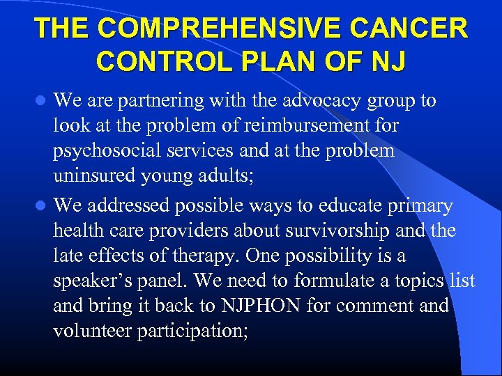 THE COMPREHENSIVE CANCER CONTROL PLAN OF NJ We are partnering with the advocacy group to look at the problem of reimbursement for psychosocial services and at the problem uninsured young adults; l We addressed possible ways to educate primary health care providers about survivorship and the late effects of therapy. One possibility is a speaker’s panel. We need to formulate a topics list and bring it back to NJPHON for comment and volunteer participation; l