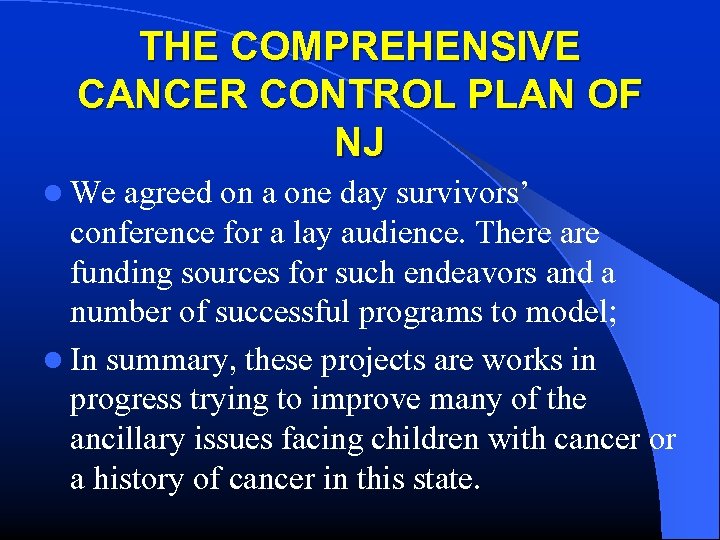 THE COMPREHENSIVE CANCER CONTROL PLAN OF NJ l We agreed on a one day survivors’ conference for a lay audience. There are funding sources for such endeavors and a number of successful programs to model; l In summary, these projects are works in progress trying to improve many of the ancillary issues facing children with cancer or a history of cancer in this state.