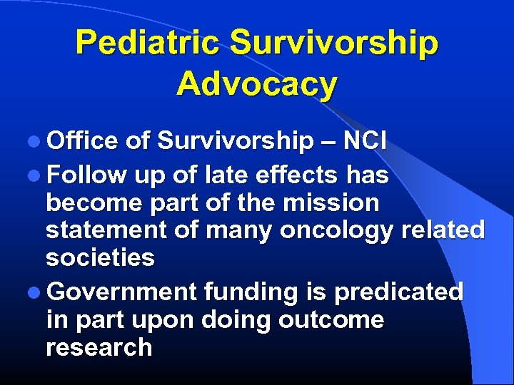 Pediatric Survivorship Advocacy l Office of Survivorship – NCI l Follow up of late effects has become part of the mission statement of many oncology related societies l Government funding is predicated in part upon doing outcome research