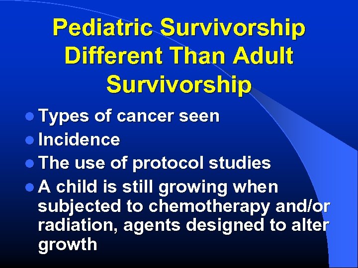 Pediatric Survivorship Different Than Adult Survivorship l Types of cancer seen l Incidence l The use of protocol studies l A child is still growing when subjected to chemotherapy and/or radiation, agents designed to alter growth