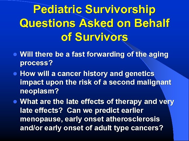 Pediatric Survivorship Questions Asked on Behalf of Survivors Will there be a fast forwarding of the aging process? l How will a cancer history and genetics impact upon the risk of a second malignant neoplasm? l What are the late effects of therapy and very late effects? Can we predict earlier menopause, early onset atherosclerosis and/or early onset of adult type cancers? l