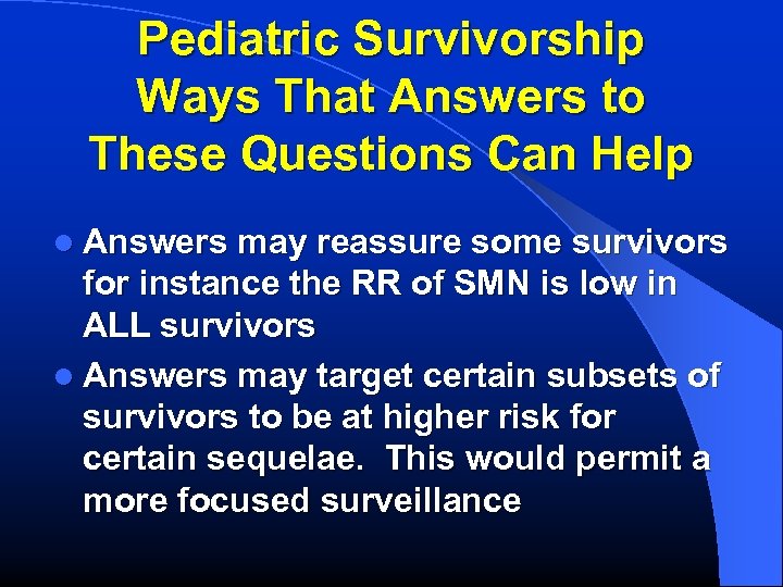 Pediatric Survivorship Ways That Answers to These Questions Can Help l Answers may reassure some survivors for instance the RR of SMN is low in ALL survivors l Answers may target certain subsets of survivors to be at higher risk for certain sequelae. This would permit a more focused surveillance