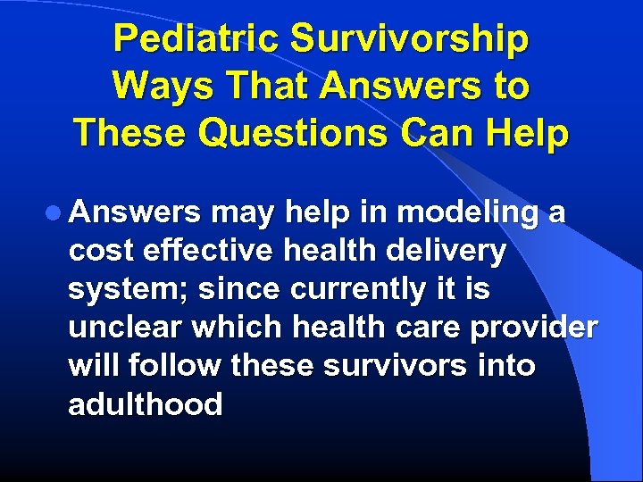 Pediatric Survivorship Ways That Answers to These Questions Can Help l Answers may help in modeling a cost effective health delivery system; since currently it is unclear which health care provider will follow these survivors into adulthood