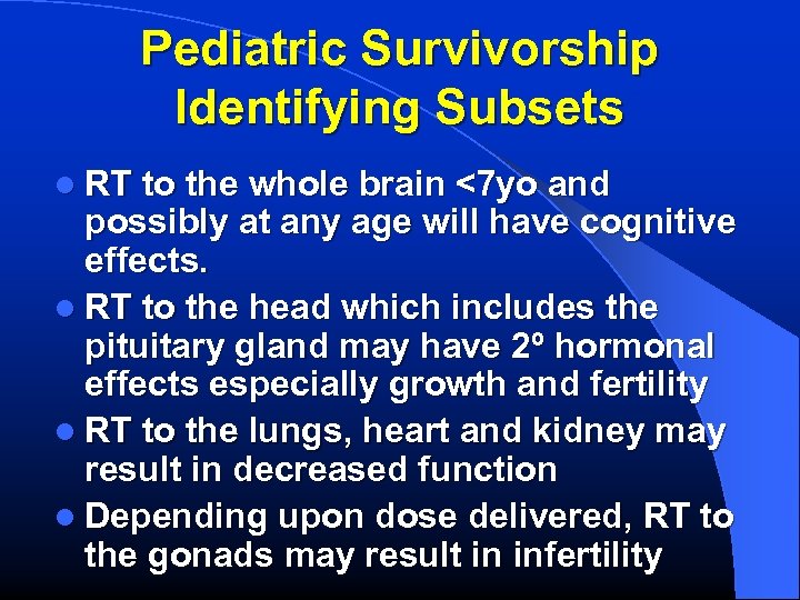 Pediatric Survivorship Identifying Subsets l RT to the whole brain <7 yo and possibly at any age will have cognitive effects. l RT to the head which includes the pituitary gland may have 2º hormonal effects especially growth and fertility l RT to the lungs, heart and kidney may result in decreased function l Depending upon dose delivered, RT to the gonads may result in infertility