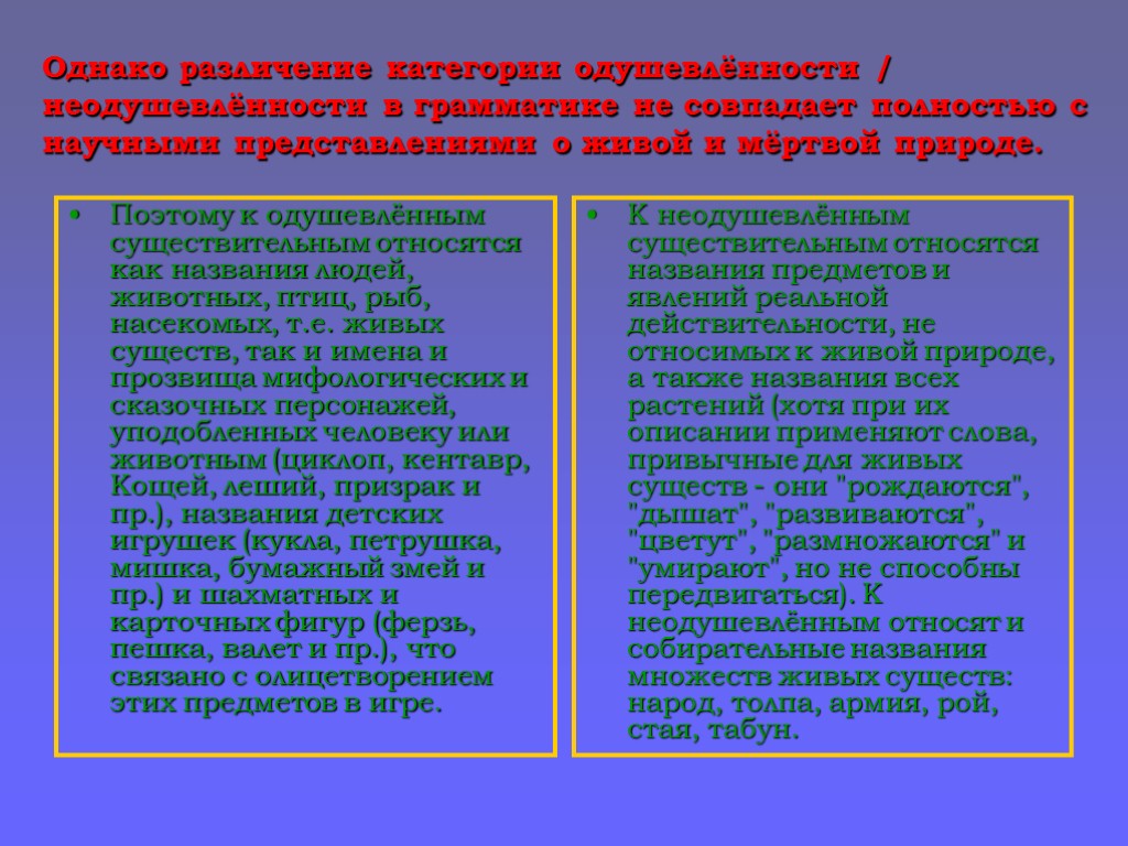 Однако различение категории одушевлённости / неодушевлённости в грамматике не совпадает полностью с научными представлениями о живой и мёртвой природе. Поэтому к одушевлённым существительным относятся как названия людей, животных, птиц, рыб, насекомых, т.е. живых существ, так и имена и прозвища мифологических и сказочных персонажей, уподобленных человеку или животным (циклоп, кентавр, Кощей, леший, призрак и пр.), названия детских игрушек (кукла, петрушка, мишка, бумажный змей и пр.) и шахматных и карточных фигур (ферзь, пешка, валет и пр.), что связано с олицетворением этих предметов в игре. К неодушевлённым существительным относятся названия предметов и явлений реальной действительности, не относимых к живой природе, а также названия всех растений (хотя при их описании применяют слова, привычные для живых существ - они "рождаются", "дышат", "развиваются", "цветут", "размножаются" и "умирают", но не способны передвигаться). К неодушевлённым относят и собирательные названия множеств живых существ: народ, толпа, армия, рой, стая, табун.
