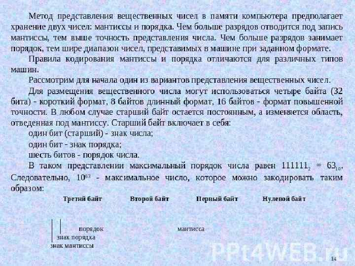 Для представления информации в памяти ЭВМ (как числовой, так и не числовой) используется двоичный способ кодирования. Элементарная ячейка памяти ЭВМ имеет длину 8 бит (байт). Каждый байт имеет свой номер (его называют адресом). Наибольшую последовательность бит, которую ЭВМ может обрабатывать как единое целое, называют машинным словом. Длина машинного слова зависит от разрядности процессора и может быть равной 16, 32, 64 битам и т. д.