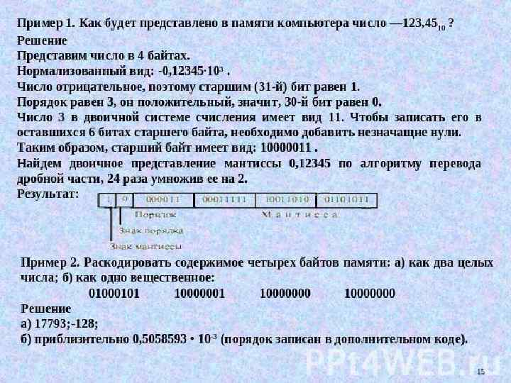 * Существуют два способа представления чисел в памяти ЭВМ. Они называются так: форма с фиксированной точкой и форма с плавающей точкой. Форма с фиксированной точкой применяется к целым числам. Под точкой здесь подразумевается знак-разделитель целой и дробной части числа. Форма с плавающей точкой — к вещественным числам (целым и дробным).