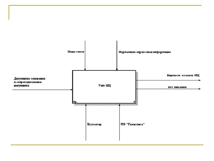 Методика IDEF 0 n n n Методология функционального моделирования IDEFO — это технология описания системы в целом как множества взаимозависимых действий, или функций. Важно отметить функциональную направленность IDEFO — функции системы исследуются независимо от объектов, которые обеспечивают их выполнение. "Функциональная" точка зрения позволяет четко отделить аспекты назначения системы от аспектов ее физической реализации Методология предназначена для функционального моделирования, т. е. моделирования выполнения функций объекта, путём создания описательной графической модели, показывающей что, как и кем делается в рамках функционирования предприятия. Наиболее часто IDEFO применяется как технология исследования и проектирования систем на логическом уровне. По этой причине он, как правило, используется на ранних этапах разработки проекта моделирования для сбора данных и моделирования процесса "как есть". (AS IS) а в совокупности с IDEF 3 и для реинжиниринга БП (AS to BE)