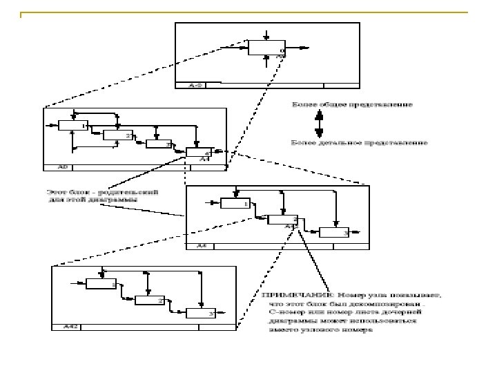 Иерархия диаграмм n n Основная идея функционального моделирования-представление диаграмм развертывающей иерархией, при этом каждый последующий уровень раскрывает, уточняет предыдущий. Блоки и диаграммы предыдущего уровня называются родительскими, а последующего дочериными.