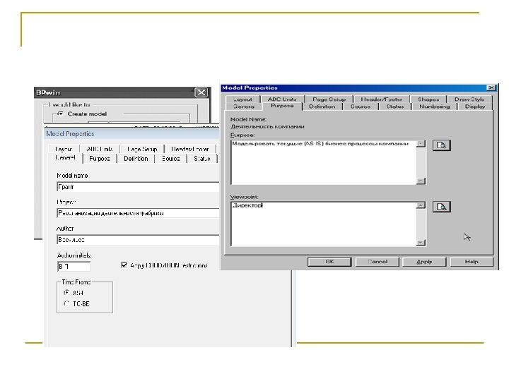 Цель моделирования n n n Цель моделирования определяется из ответов на следующие вопросы: Почему этот процесс должен быть смоделирован? Что должна показывать модель? Что может получить клиент? Точка зрения (Viewpoint). Под точкой зрения понимается перспектива, с которой наблюдалась система при построении модели. Хотя при построении модели учитываются мнения различных людей, все они должны придерживаться единой точки зрения на модель. Точка зрения должна соответствовать цели и границам моделирования. Как правило, выбирается точка зрения человека, ответственного за моделируемую работу в целом