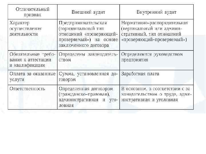 5. Виды и классификации аудита В отечественной теории и практике аудита можно выделить следующие классификации: 1. По субъекту осуществления проверки выделяют: - Внешний аудит - Внутренний аудит