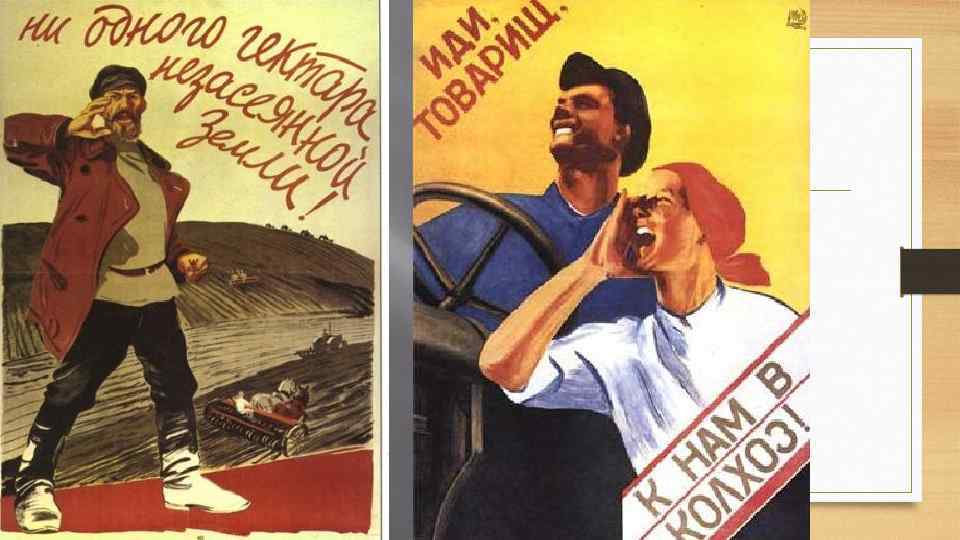 Как изменилось крестьянское хозяйство? • Было покончено с разделением крестьян на бедноту, середняка и кулака. К 1937 г. 93% крестьянских хозяйств были объединены в колхозы и совхозы. Государственная земля закреплялась за колхозами в вечное пользование. Колхозы располагали землей и рабочей силой. Машины давали государственные машинно-тракторные станции (МТС). За свою работу МТС брали частью собранного урожая. На колхозах лежала ответственность сдавать государству по «твердой цене» 25 -33% продукции. • Формально руководство колхозом осуществлялось на основе самоуправления: общее собрание колхозников избирало председателя, правление и ревизионную комиссию. Фактически же колхозами управляли райкомы партии.