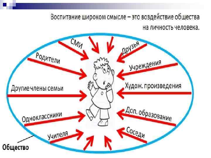 Воспитание В широком смысле воспитание – деятельность по приобщению человека к социальному опыту; социализация личности. n Институтом воспитания в этом случае – среда – школа, улица, семья, неформальные группы, СМИ n