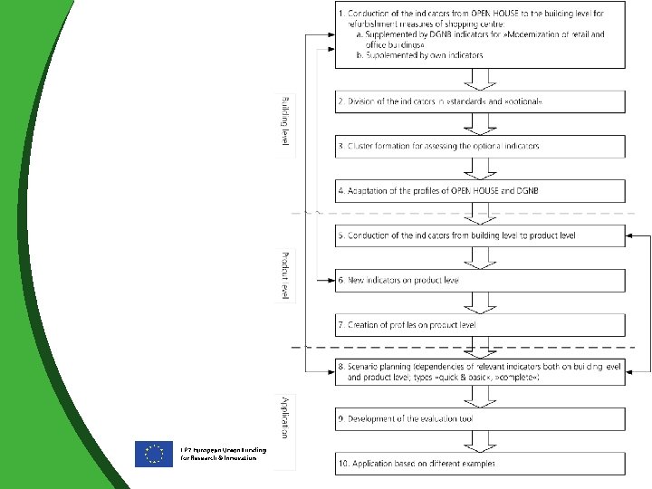Methodology • » OPEN HOUSE « – and in addition, indicators from national certification systems (DGNB, BREEAM, LEED) as a basis and adapted to refurbishment measures of shopping center. • Adaption of the sustainability indicators on product level: “How does my product influence the sustainability of the shopping center? ” • Development of the evaluation tool: First on product level, later on building level • The application is based on different examples. Building level Product level Application