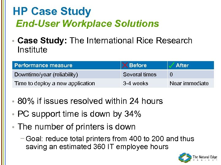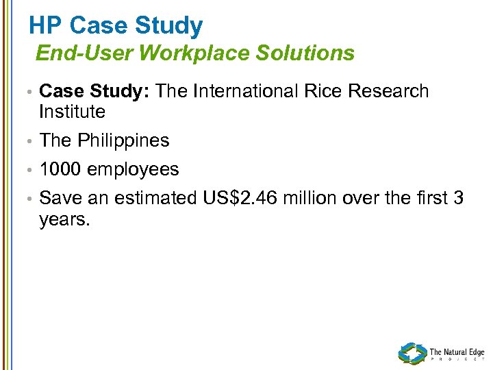 HP Case Study End-User Workplace Solutions Case Study: The International Rice Research Institute • The Philippines • 1000 employees • Save an estimated US$2. 46 million over the first 3 years. •